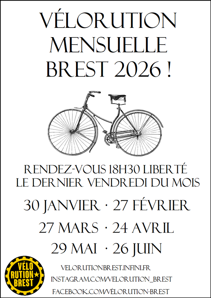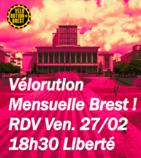 La Vélorution de Février 2026 passera par Liberté, St Michel, Place de Strasbourg pour terminer en bas des marches du bar Perruche bas de Siam avant le pont de Recouvrance. L’occasion de passer un moment convivial ensemble autour d’un verre.