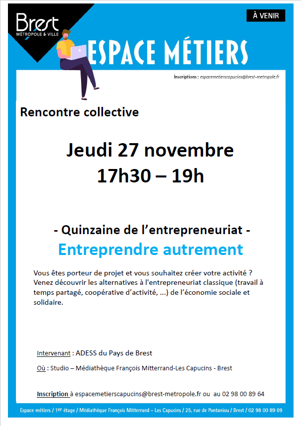 Inscription à espacemetierscapucins@brest-metropole.fr ou au 02 98 00 89 64