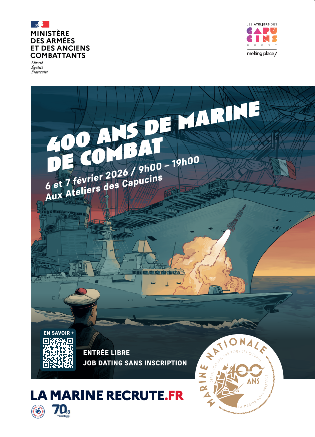 Dans le cadre des commémorations du quatre-centième anniversaire de la Marine nationale, le Service de Recrutement de la Marine organise l’événement « 400 ans de Marine de combat », les vendredi 6 et samedi 7 février 2026, aux Ateliers des Capucins à Brest.