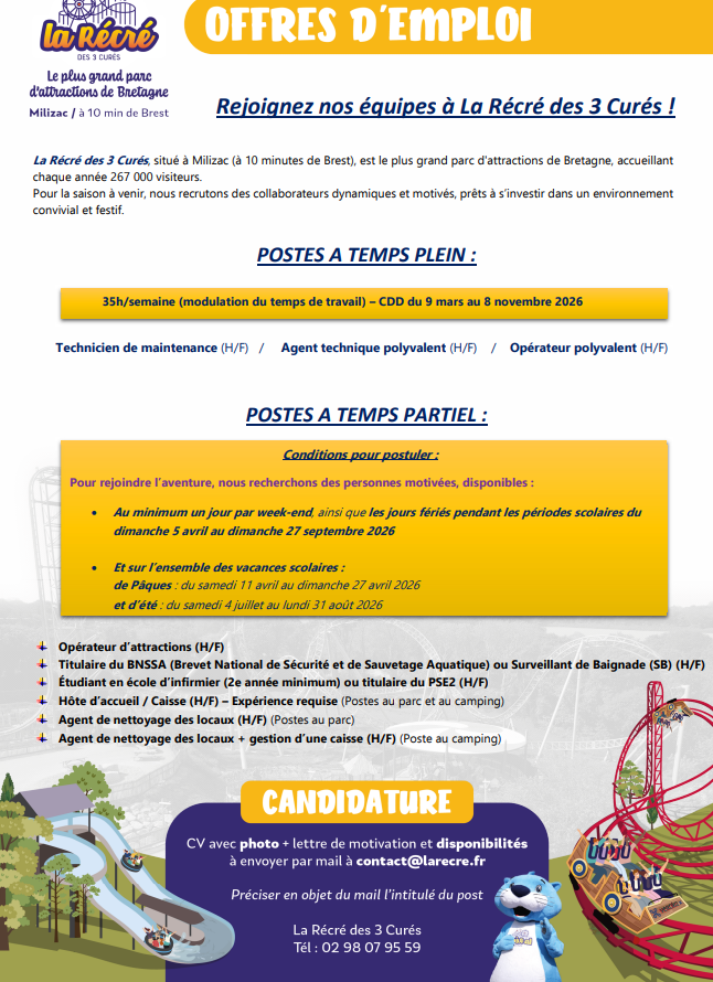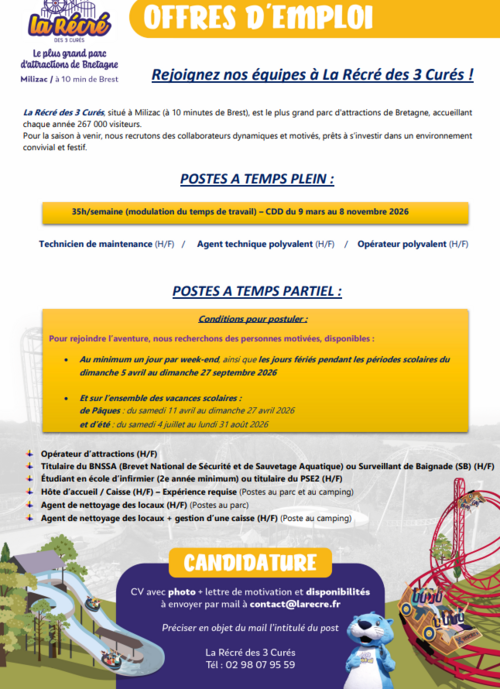 La Récré des 3 Curés, situé à Milizac (à 10 minutes de Brest), est le plus grand parc d’attractions de Bretagne, accueillant chaque année 267 000 visiteurs. Pour la saison à venir, nous recrutons des collaborateurs dynamiques et motivés, prêts à s’investir dans un environnement convivial et festif.