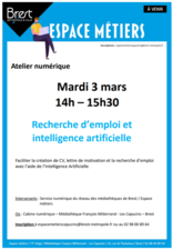 L’Espace Métiers de Brest Métropole propose un atelier numérique pour découvrir comment l’intelligence artificielle peut accompagner votre recherche d’emploi.