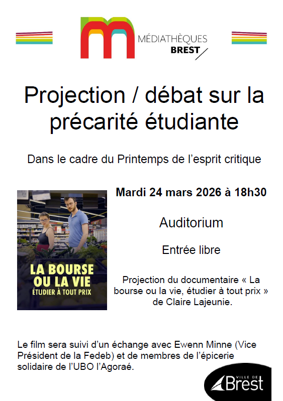 Dans le cadre du Printemps de l’esprit critique, les Médiathèques de Brest proposent une soirée de projection et d’échanges autour de la précarité étudiante.