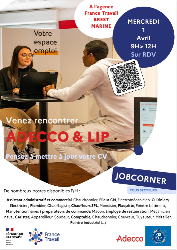 Bonne nouvelle pour les personnes en recherche d’emploi ! L’agence France Travail Brest Marine organise un Job Corner avec la présence des agences Adecco et LIP. Une matinée idéale pour échanger directement avec des recruteurs et saisir des opportunités concrètes.